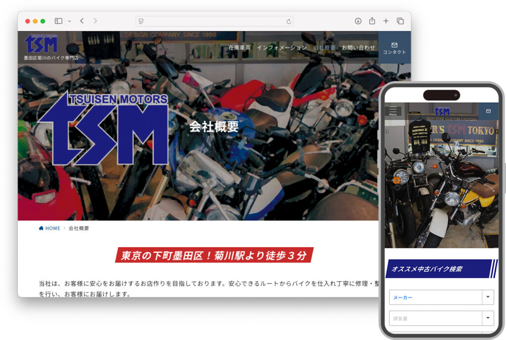 ティ・エス・エム 様 墨田区菊川のバイク専門店。お客様に安心をお届けするお店づくりを目指しています。信頼できるルートからバイクを仕入れ、丁寧に整備。遠方の方にも実績ある陸送会社を利用し、安全にお届けします。 WEBサイトを見る ご利用サービス オリジナルデザイン 定型デザイン 修理/車検ページ 買取ページ オリジナルページ パーツ販売 カスタムギャラリー 作業/来店予約 買取査定フォーム ブログ